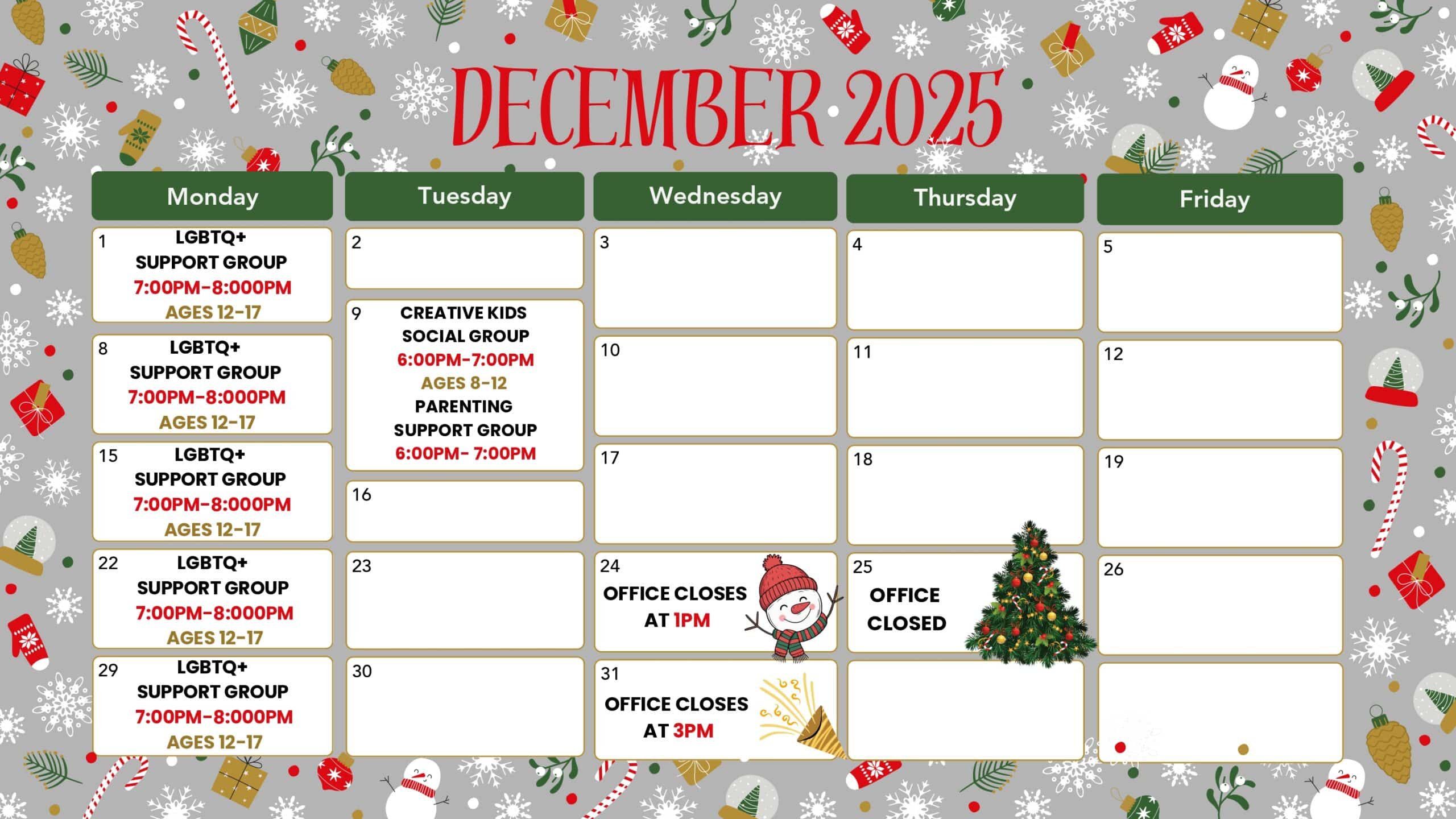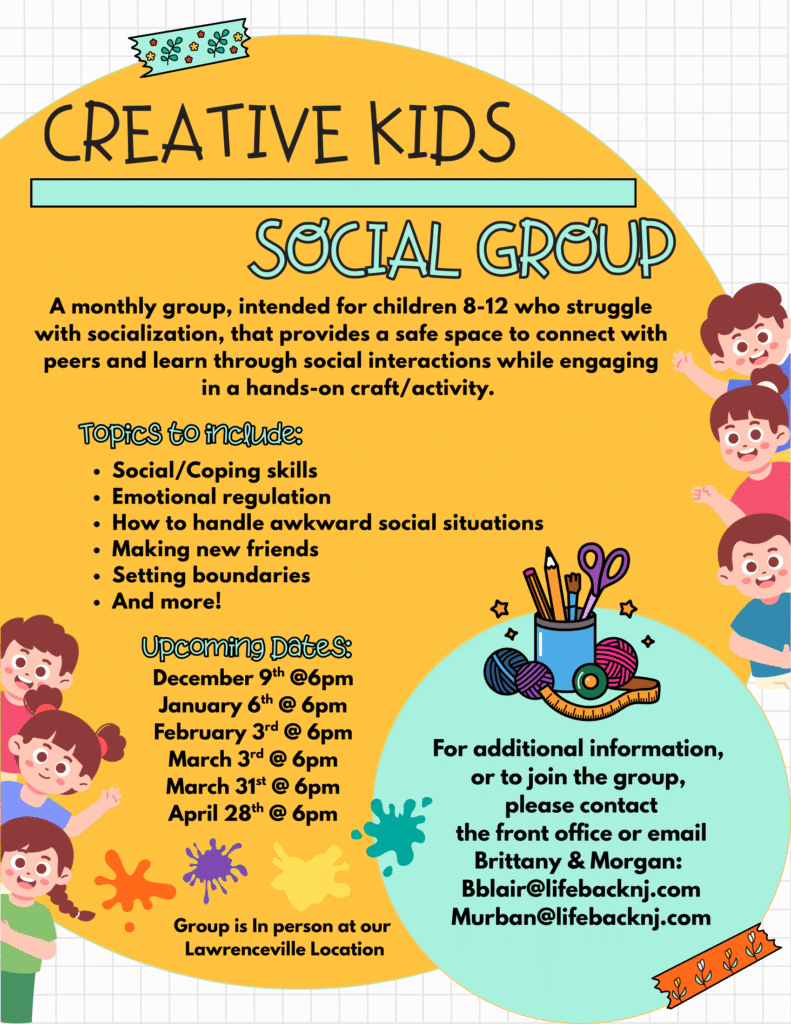 TOPICS TO INCLUDE: SOCIAL/COPING SKILLS, EMOTIONAL REGULATION, HOW TO HANDLE AWKWARD SOCIAL SITUATIONS, MAKING NEW FRIENDS, SETTING BOUNDARIES, AND MORE!